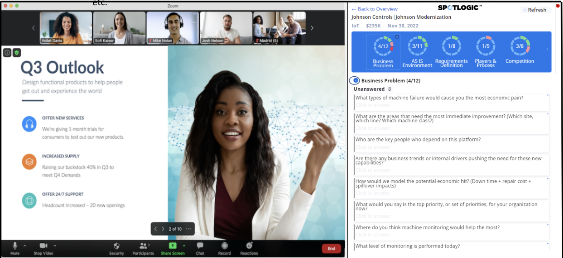 The first customer call is a Zoom. The customer mentions at the outset that they don't allow meeting transcriptions. That's fine — SpotLogic doesn't require them. Your rep opens SpotLogic on the desktop alongside the video call. Based on the current state of the Information Position, SpotLogic has already suggested the most valuable topics and questions to focus on in this meeting — starting with the business problem, where the gaps are most urgent. Your rep reviews the recommendation, makes any adjustments they see fit, and enters the conversation with a clear path into the customer's world. No guesswork. No blanks. Just the right questions at the right moment.