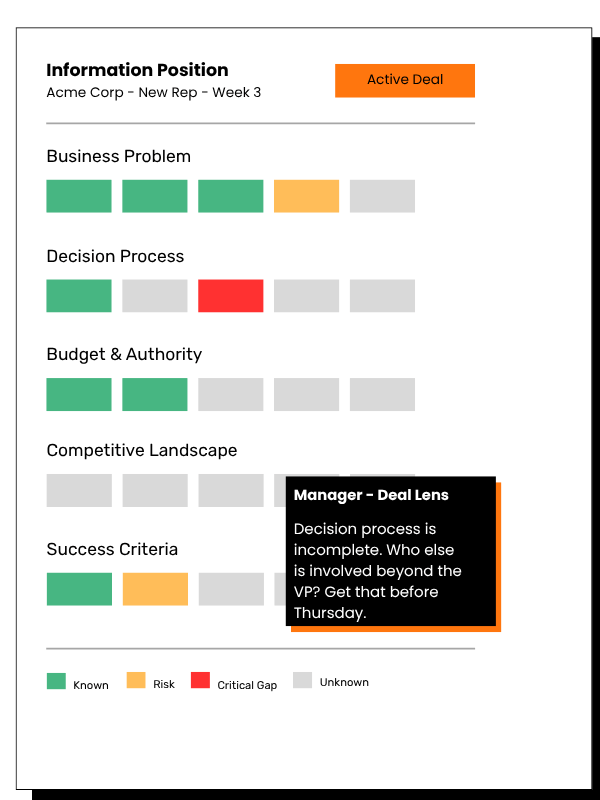 The Deal Lens is the manager's view of the Information Position across every new rep and each of their deals. Filtered to show only the variables the manager cares about most. Updated in real time. It replaces the pre-coaching interrogation call with immediate clarity so that every coaching conversation starts at the point of actual need.